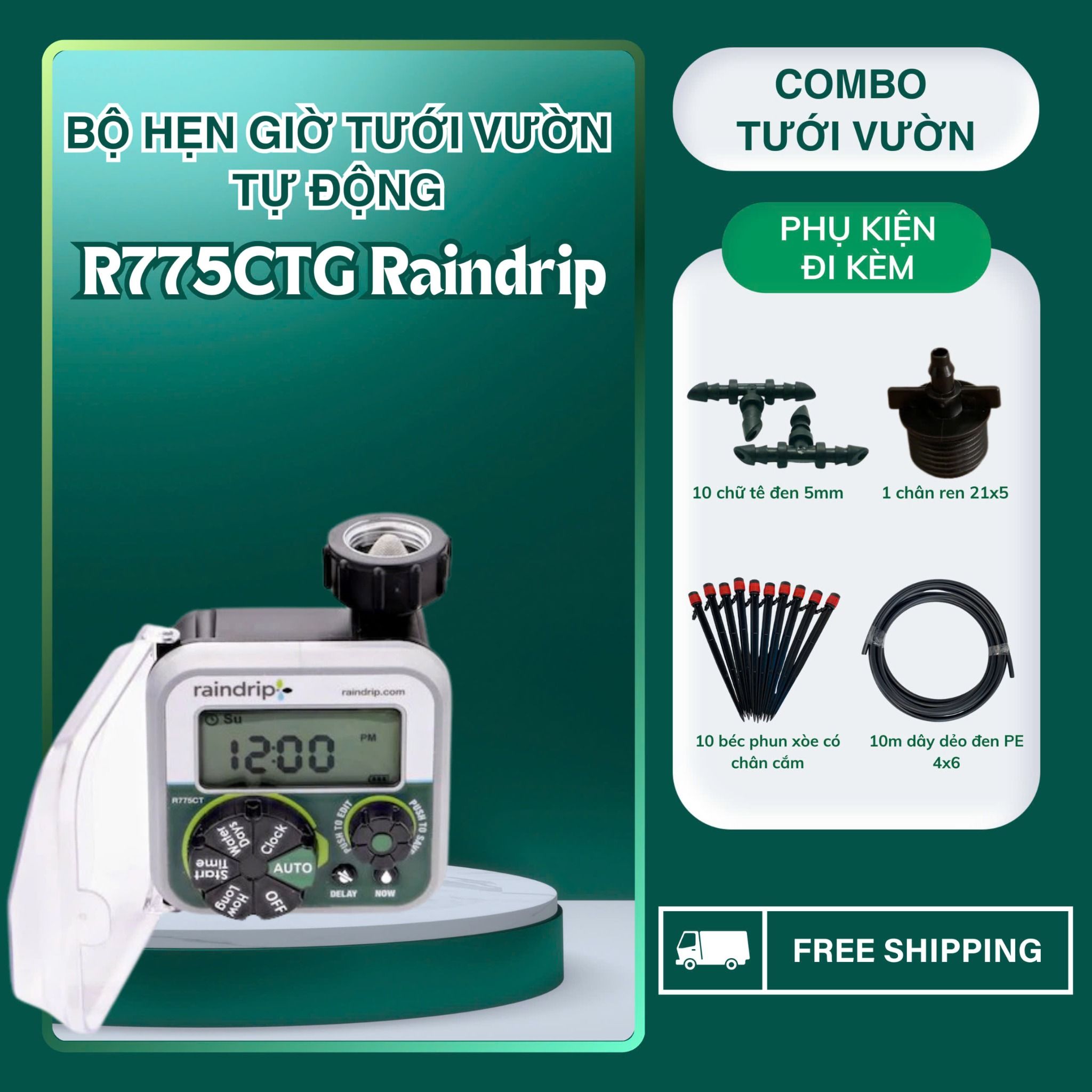 Bộ hẹn giờ tưới vườn tự động Raindrip, kèm theo combo thiết bị tưới cho diện tích từ 20 đến 200m², gồm: